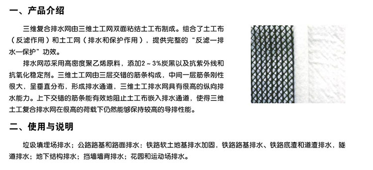 三維復合排水網是一種新型的排水土工材料。以高密度聚乙烯(HDPE)為原料,經特殊的擠出成型工藝加工而成,具有三層特殊結構。中間筋條剛性大,縱向排列,形成排水通道,上下交叉排列的筋條形成支撐防止土工布嵌入排水通道,即使在很高的荷載下也能保持很高的排水性能。雙面粘接滲水土工布復合使用,具有“反濾--排水--透氣--保護”綜合性能,是目前理想的排水材料。